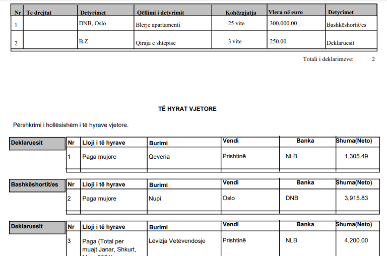Ndërsa bashkëshortja e Kurtit merr 3 mijë e 915 euro pagë mujore nga një kompani në Oslo të Norvegjisë.